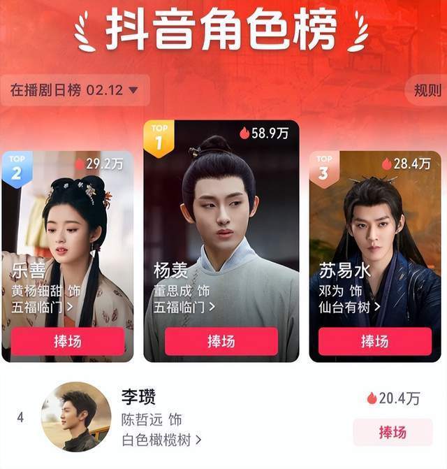 我们可以发现,《仙台有树》和《掌心》播出之后,这两部剧的各项数据相差不大,但《仙台有树》的热度要比《掌心》高,可是乐善和杨羡的剧情更新后,一件意想不到的事情却发生了,董思成凭借“杨羡”直接登顶角色榜单,黄杨钿甜饰演的“乐善”获得第二名,而邓为饰演的“苏易水”排在第三名。