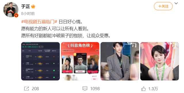 紧接着,于正发出一条消息:日日好心情,愿有能力的新人可以让所有人看到。愿所有好剧都能冲破黑子的枷锁,让观众受惠。于正发出消息,主要想透露两个重要信息,一个是《五福临门》播出的还不错,另一个是推荐两位演员,一位是黄杨钿甜,一位是董思成。
