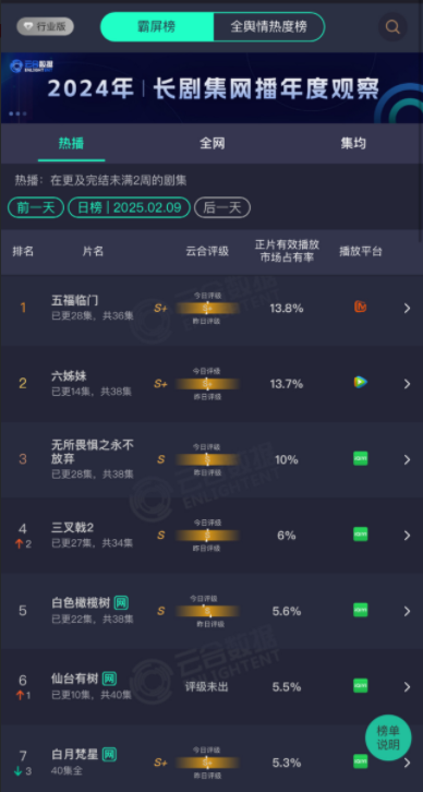 当《五福临门》正在热播的时候,《仙台有树》《掌心》《六姊妹》也播出了,随着剧情更新,网友们发现,《五福临门》的播出效果非常不错,根据云和数据显示《五福临门》正片有效播放市场占有率高达15.3%,成为第一名。